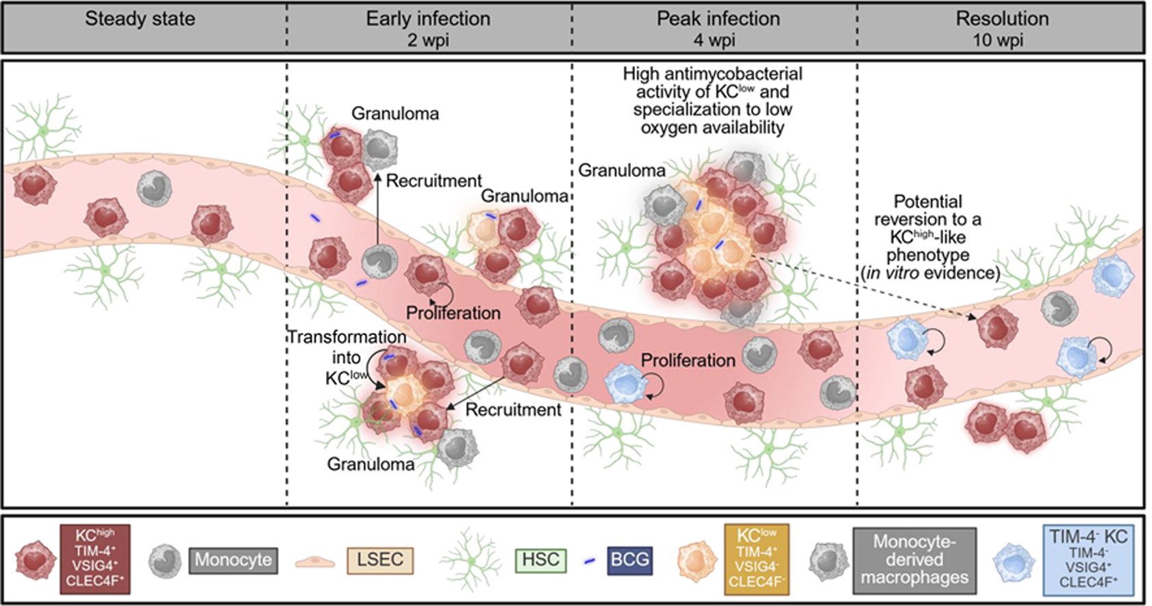 Models of systemic chronic infection with Mycobacterium bovis or Mycobacterium avium were combined with genetic monocyte deficiency (Ccr2-/-, Irf8-/-), KC fate-mapping mice, bone marrow transplantation, high-resolution imaging and immunophenotyping. In addition, ATAC, bulk RNA, and single cell RNA sequencing were conducted to specifically delineate origin, heterogeneity, and adaptations of KCs during infections.